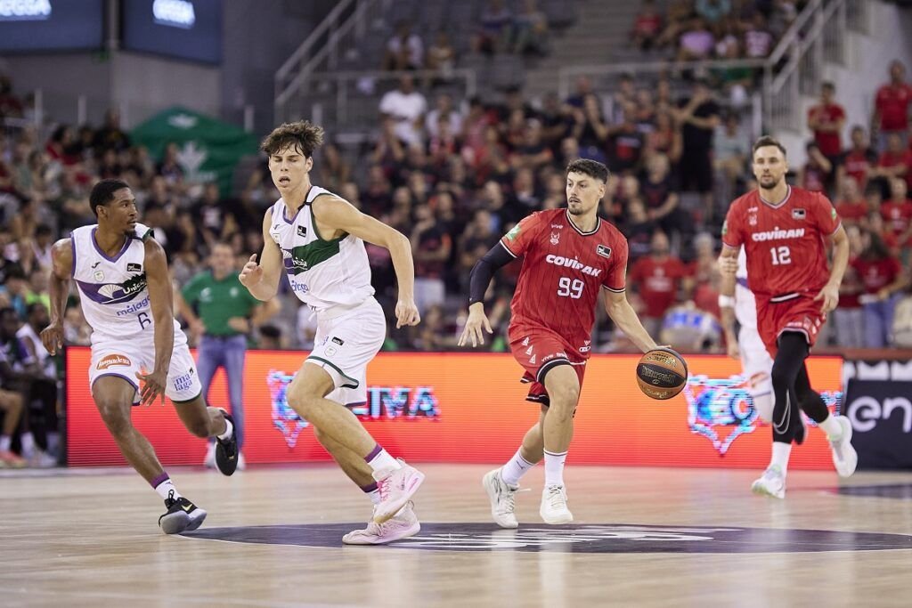 Las primeras acciones dejando constancia que estamos en pretemporada con pocos entrenamientos aún desarrollados y plantillas terminando de perfilarse. Los errores en el tiro y las pérdidas se sucedían, incluso más acuciantes en los anfitriones. El quinteto inicial nazarí con dos caras nuevas y tres ‘repetidores’. Tyson Carter activaba el luminoso con un 2+1 habiéndose jugado dos minutos largos. Una nueva pérdida de Coviran es aprovechada en contraataque por Nihad Djedovic (0-5). Una penetración de Lluis Costa inexplicablemente la erraba y en la jugada siguiente Unicaja Málaga rompía el duelo con un triple de Carter (0-8). El primer enceste de los rojinegros, más rojos que nunca por la equipación, llegó a falta de 6:08 en una bandeja del base de Sant Just Desvern, Lluis Costa Martínez. Bueno, un pequeño respiro (2-8). Aunque la ‘sangría inicial’ iba a continuar. Dos tiros libres convertidos por Dylan Osetkowski, un rebote ofensivo conquistado por Will Thomas con un estético gancho posterior y entremedias un error en el lanzamiento de David Iriarte, dejaban la ventaja forastera en (2-12). Un parcial que iba a detener el técnico local Pablo Pin Tamayo con un tiempo muerto a falta de 5.10.